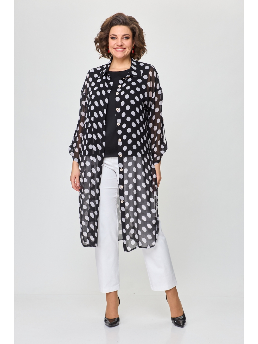 Рубашка из шифона удлинённая ниже колена с фигурными подрезами по бокам. Рукав втачной, длина рукава регулируется патой. Воротник рубашечного типа, застёжка на планке с пуговицами.