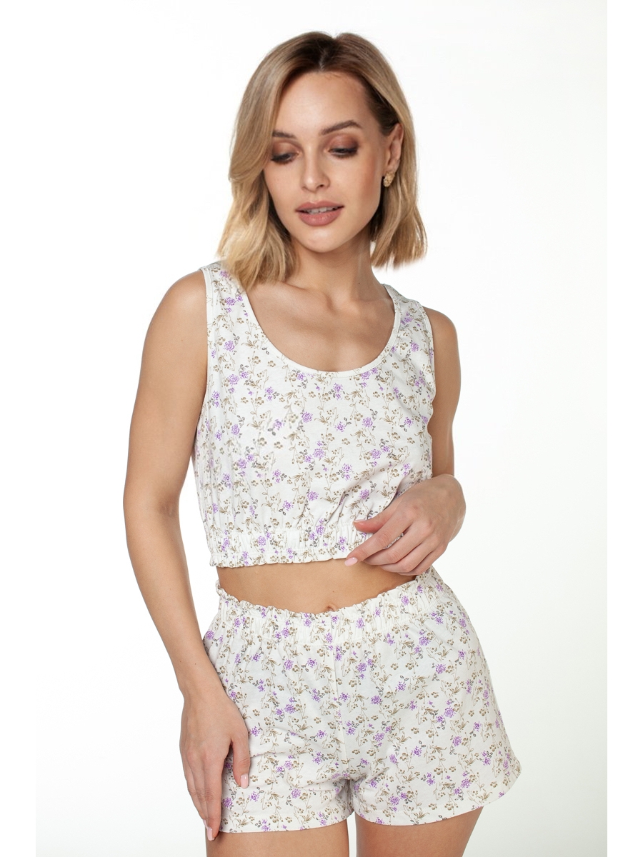 Комплект женский состоит из топа на бретельках и шорт на резинке. Благодаря натуральному составу (95% хлопок/5% эластан) комплект приятен к телу, не ситесняет движения.