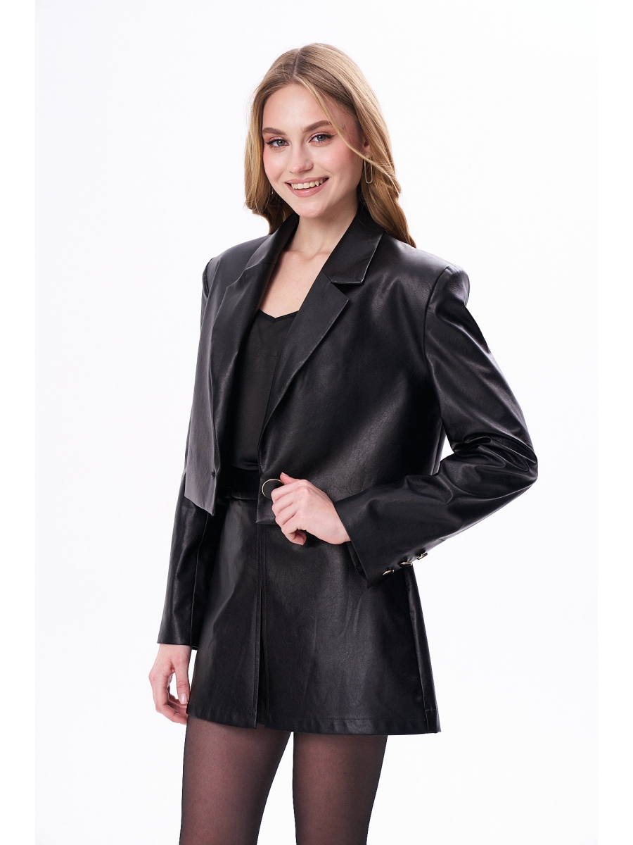 Укороченный жакет прямого силуэта длиной чуть ниже линии талии. Воротник и лацкан классические. Линия плеча слегка расширена. Застежка на одну пуговицу. На рукавах шлицы с пуговицами.