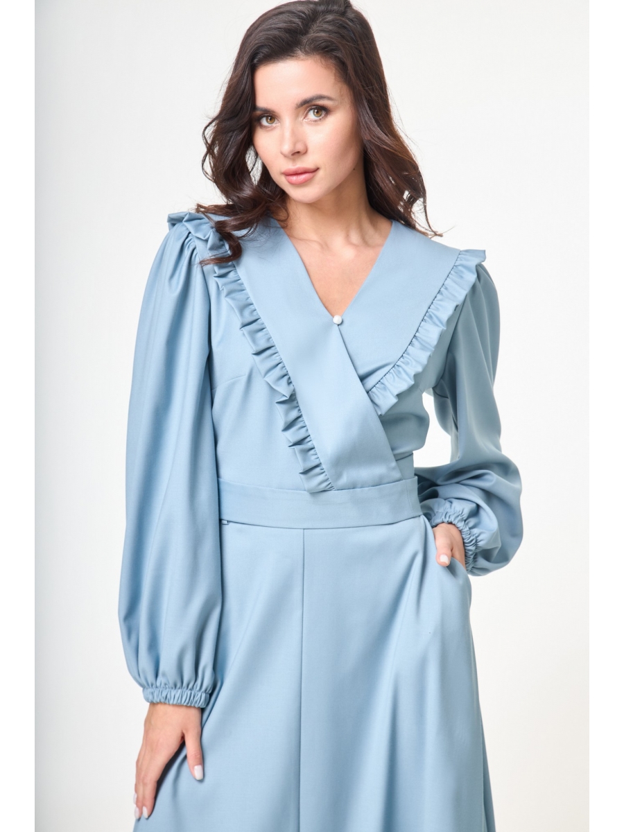 Жакет короткий, до талии, на запах, по переду и спинке декорирован рюшами. Рукав длинный, объёмный, по низу на резинке. Жакет фиксируется при помощи пояса, а так же по спинке на резинке, для лучшего приталивания. Так же по переду петля пуговица, для фиксации декольте.