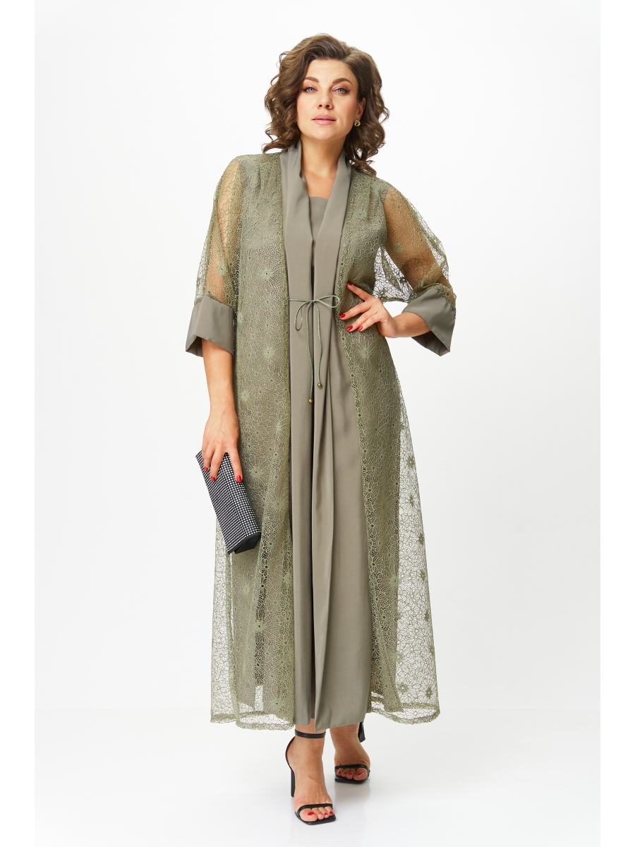 Нарядный и эффектный женский комплект, состоящий из двух предметов: длинного струящегося кардигана из кружева, который надевается поверх платья прямого полуприлегающего силуэта, с симметричными разрезами по переду.
