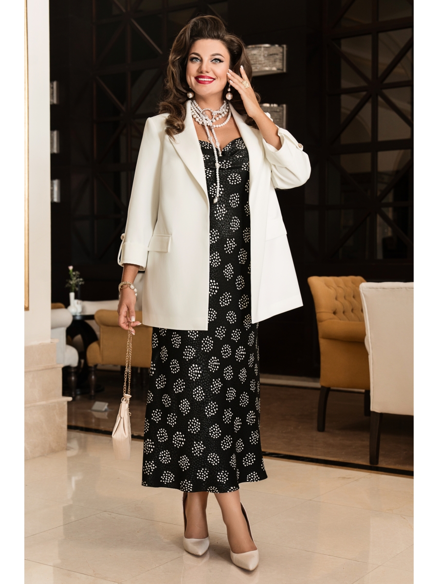 Безумно красивый и стильный комплект в элегантном сочетании однотонного жакета и платья с интересной интерпретацией принта в «горошек» подойдет и для строгого образа, и для создания светлого, яркого и нежного лука с романтичными мотивами.