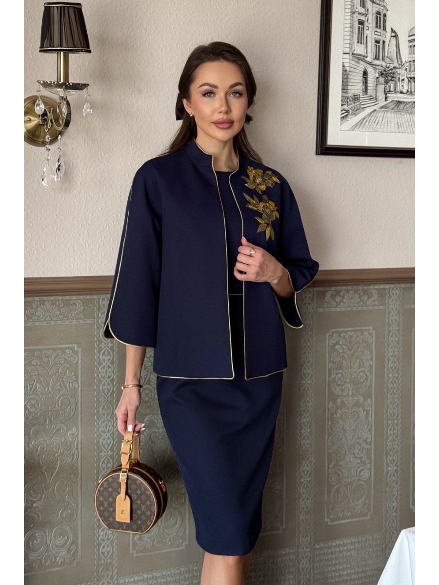 Нет ничего прекраснее, чем женский костюм с вышивкой. Этот красивый костюм придаст вашему образу утонченности и изящества. Костюм женский двухпредметный из костюмно-плательной ткани, состоит из платья-футляр с коротким рукавом на подкладке и жакета без застежки на подкладке с декоративной вышивкой и отделочным кантом. Жакет женский прямой с рукавом реглан, без застежки с отделочным кантом и декоративной вышивкой. Перед с нагрудной вытачкой, выходящей из рельефного шва, идущего от проймы до низа. Спинка со средним швом. Горловина круглой формы, обработана воротником-стойкой. Рукав реглан, двухшовный с разрезом Платье женское полуприлегающего силуэта на трикотажной подкладке. Перед с рельефными швами, выходящим из проймы до горизонтального подреза на уровне линии талии с кантом. Нижняя часть переда платья с талиевыми вытачками, идущими на продолжение рельефных швов. Спинка платья с талиевыми вытачками и средним швом, в котором обработана застежка на потайную тесьму-молнию и разрезом. Горловина круглой формы, обработана подкладкой. Рукава втачные одношовные, короткие.
