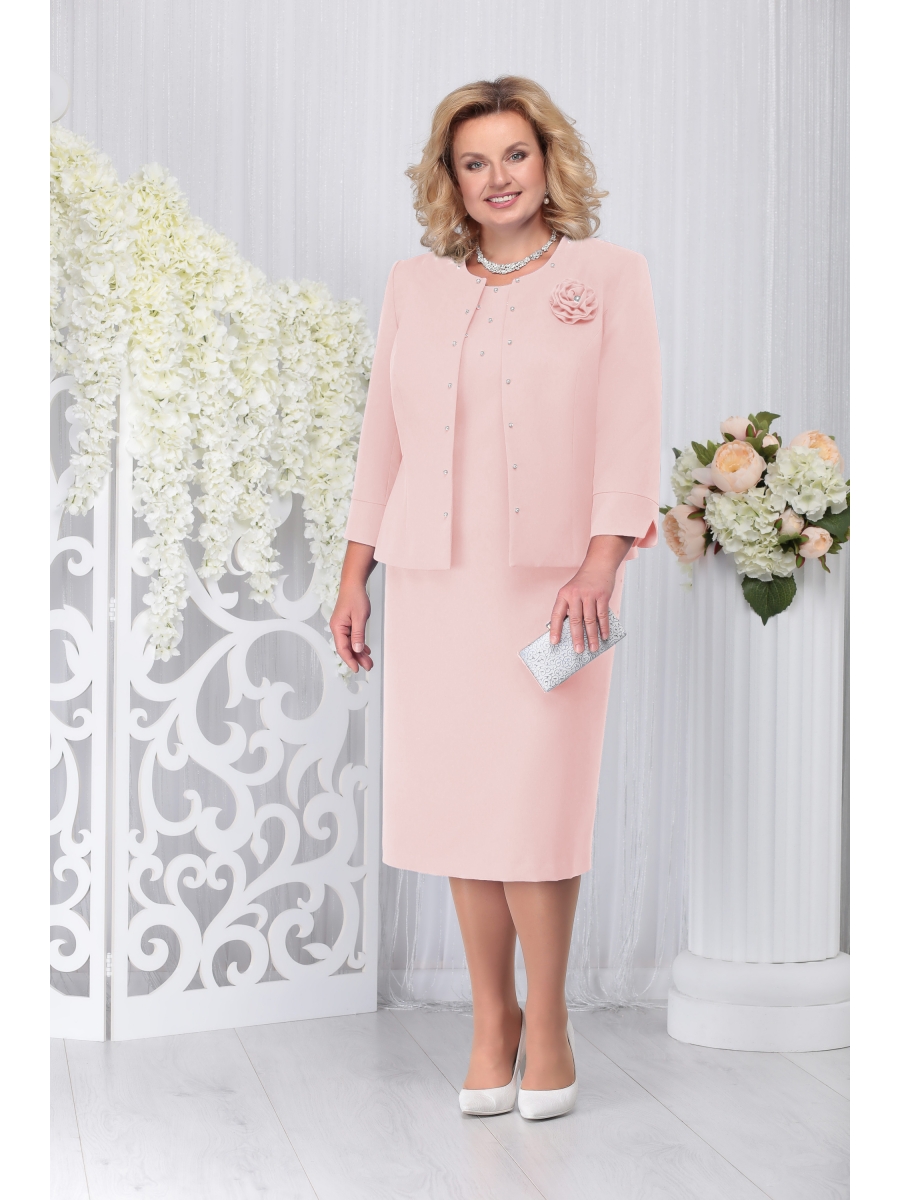 Комплект женский, состоящий из жакета и платья. Жакет полуприлегающего силуэта, на подкладке. Длина жакета по среднему шву спинки 55,0 см. Рельефы переда выходят из проймы, проходят через центр груди вниз. Спинка со средним швом и рельефами, выходящими из проймы вниз. Рукава втачные, длиной 50,0 см., двухшовные, с притачной манжетой, с разрезом на шве. Без застёжки, горловина и борта обтачные, с прямыми углами. По краю борта и по краю горловины нашиты бусинки. На левой части переда прикреплён декоративный цветок с бусинкой. Изделие с плечевыми накладками. Платье полуприлегающего силуэта, чуть зауженное к низу, на подкладке из дышащей, приятной на ощупь и достаточно эластичной ткани. Длина по среднему шву спинки 108,0 см. На детали переда между нагрудными выточками, выходящими из проймы, пришиты бусинки. Спинка с талевыми выточками, в среднем шве спинки обработана застёжка на потайную тесьму молнию и шлица. Горловина круглая, спереди углублённая, обтачная. Рукава втачные, одношовные, длиной 42,0 см. Изделие с плечевыми накладками.