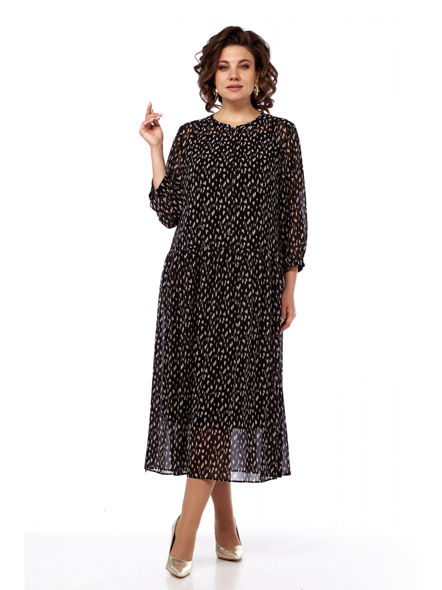 Платье А-силуэта, с круглым вырезом горловины, обработанного воротником-стойкой. Отрезное ниже линии талии, юбка со сборкой. Перед с нагрудными вытачками, центральной застежкой-планкой на петли и пуговицы. Спинка с кокеткой. Рукава втачные, одношовные, длиной 3/4, с манжетой по низу.