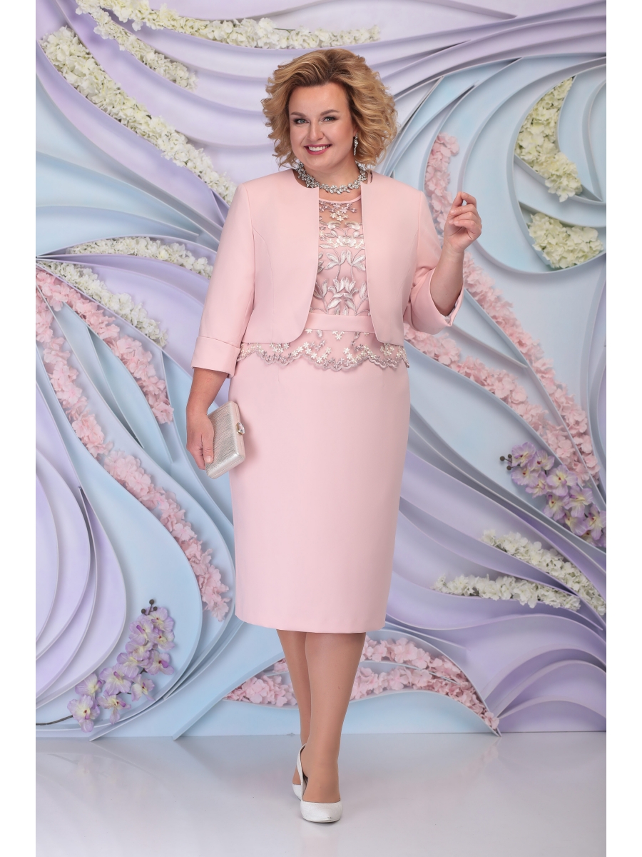 Платье женское, полуприлегающего силуэта, с отрезным поясом по линии талии, чуть зауженное к низу. Длина по среднему шву спинки 109,0 см. Нижняя часть лифа с обрезанной плечевой частью, с обтачным вырезом декольте. В шов обтачивания декольте вставлены обтачные бретели, шириной 3,0 см частью. Верхняя часть двойная, нижняя часть из основной ткани, верхняя из гипюра. Нагрудные выточки выходят из проймы. На нижней части спинки талевые выточки. Юбка с выточками, на подкладке из дышащей, приятной на ощупь и достаточно эластичной ткани с баской из гипюра. Рукава втачные, одношовные, длиной 28,0 см. Горловина круглая, углублённая, окантованная. В среднем шве спинки обработана застёжка на потайную тесьму молнию и шлица.