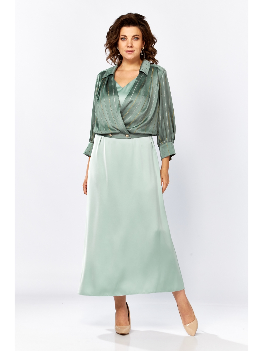 Женский комплект, состоит из платья и блузы, выполнен из однотонного атласа и атласа в полоску.