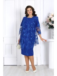 Платье женское, полуприлегающего силуэта, выполнено из костюмно-плательной ткани. Модель на подкладке, с плечевыми накладками. Перед с рельефными швами, направленными от горловины; центральная часть декорирована цветочной аппликацией, настроченной от горловины до низа. На спинке обработаны рельефные швы, направленные от горловины; в верхней части среднего шва спинки предусмотрена застежка на потайную тесьму-«молнию» (50 см), в нижней части – шлица. Вырез горловины округлый, углубленный по переду. Рукав короткий, втачной. Длина платья – 104 см, длина рукава – 25 см.