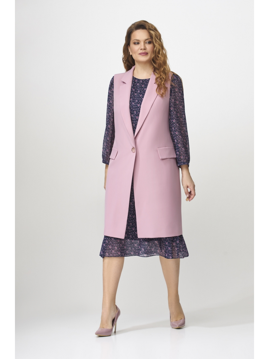 Платье А- образного силуэта на подкладке. Перед с нагрудными вытачками. Спинка со средним швом сверху с разрезом и застежкой на петлю и пуговицу. Рукав втачной одношовный со сборкой по окату и по шву притачивания манжеты. Низ рукава обработан манжетой, которая застегивается на петлю и пуговицу. К платью прилагается пояс из основной ткани.