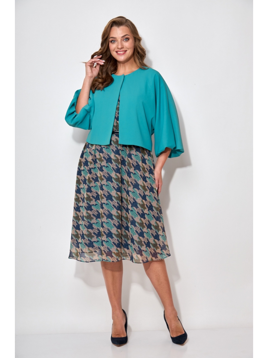 Нарядный женский комплект, состоящий из укороченного жакета на подкладке и шифонового платья на подкладке. Жакет с застежкой на кнопку, вырез горловины круглый, рукав длиной ¾, пышный по низу. Платье свободного силуэта, расширенное к низу, длиной ниже колена, с коротким рукавом. В качестве декора прилагается тонкий ремень.