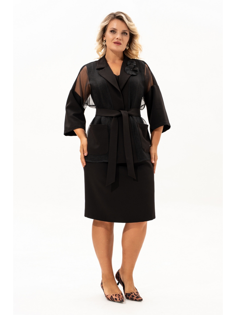 Невероятно нарядный женский комплект - двойка ALGRANDA: жакет и платье - это стильное и комфортное решение для женщин больших размеров, которые ценят комфорт и стиль. Жакет скомбинирован из двух тканей- барби и органзы, что делает изюминку в этом шикарном комплекте. Прочный, мягкий и несминаемый комплект выглядит красиво, делая образ женственным , соблазнительным . Жакет без застежки, с функциональными карманами и спущенным плечом. Пояс, входящий в комплект, позволяет акцентировать талию и придать жакету дополнительный шик. Свободный крой жакета придаёт ему особую изысканность, идеально подобранные строчки делают его ещё более эффектным. Жакет оснащён аккуратным английским воротником . Лацкан украшен съемной бошью в виде цветка из органзы. В комплекте к жакету идёт платье полуприлегающего силуэта. Горловина платья V-образной формы, что очень красиво подчеркивает грудь . Спинка со средним швом , талиевыми выточками и шлицей. Универсальное и практичное платье длиной ниже колена. На передней полочке платья от плеча расположены рельефы. В левом боковом шве платья есть молния. Это платье очень красиво смотрится в сочетании с жакетом, но можно носить и как самостоятельное изделие. В этом комплекте вы будете выглядеть безупречно! Отличный вариант для нарядного и вечернего гардероба, а также и просто для повседневного применения. Грация, изящество, утончённые декоративные элементы делают этот комплект уникальным. Многослойность сегодня – популярный тренд моды. Это позволяет женщинам экспериментировать и создавать множество стильных аутфитов на свой вкус.Такой элегантный комплект впишется в любое мероприятие: начиная от свадьбы, дня рождения, романтического свидания, заканчивая новогодней вечеринкой.