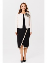 Платье полуприлегающего силуэта со спущенной линией плеча, выполненное из костюмно-плательной ткани (тянется) с отделкой из жаккардовой ткани. Перед платья состоит из двух частей. Нижняя часть платья отрезная по линии талии с ассиметричным подрезом и отрезными планками из отделочной ткани. Верхняя часть переда ассиметричной формы, отлетная с отделочным люверсом и поясом, с отрезными планками планками из отделочной ткани. По спинке – средний шов, потайная застежка-молния и талиевые вытачки. Низ переда и спинки, низ рукавов оформлен отрезными планками из отделочной ткани. Горловина округлой формы.