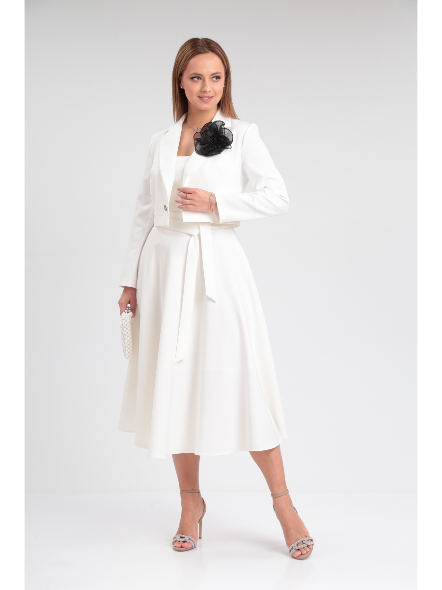 Нарядный комплект в теплом белом цвете с декоративным цветком контрастного черного состоит из легкого жакета и сарафана.