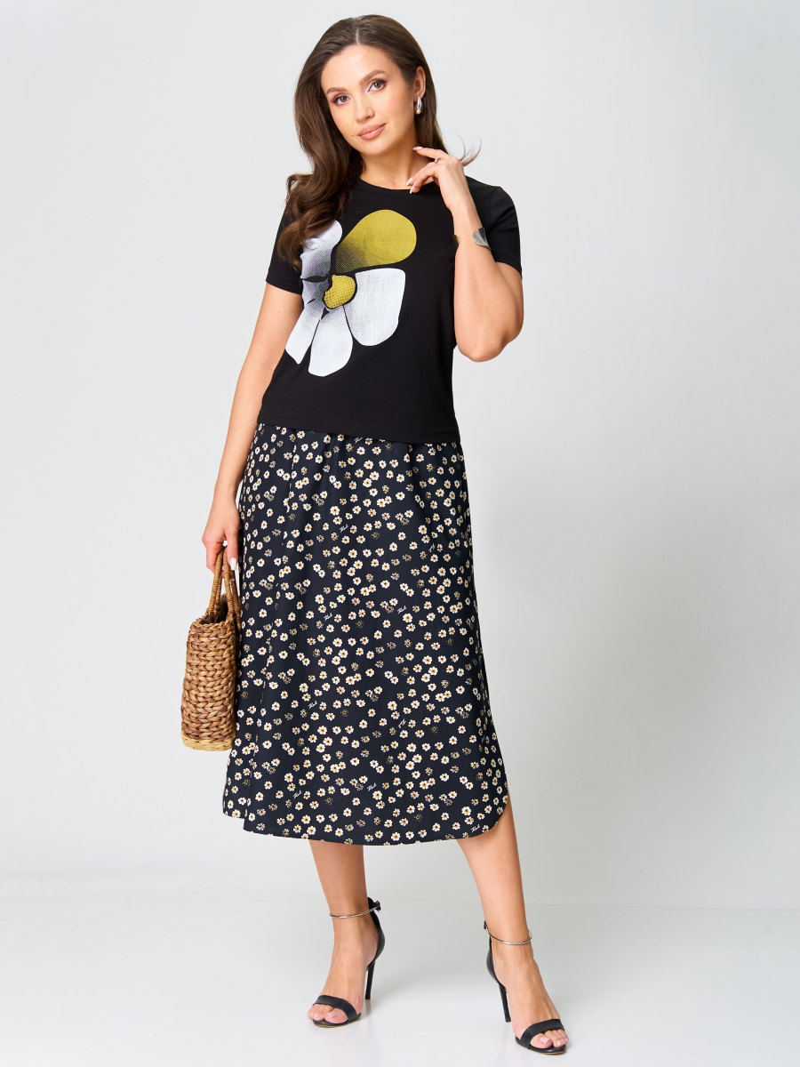 Юбка А-силуэта выполнена из хлопка. Пояс притачной на эластичной резинке. По бокам расположены наклонные карманы. Низ юбки закругленной формы с разрезами по бокам. Юбка без подкладки.