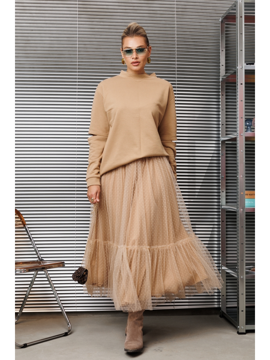 Джемпер оверсайз из трикотажного полотна. Прямого силуэта со спущенным плечом. Воротник-стойка. По рукаву идет подрез с разрезом. Низ рукава и низ джемпера - на манжете. Джемпер легко сочетается с любыми низами: брюки, джинсы, юбка.