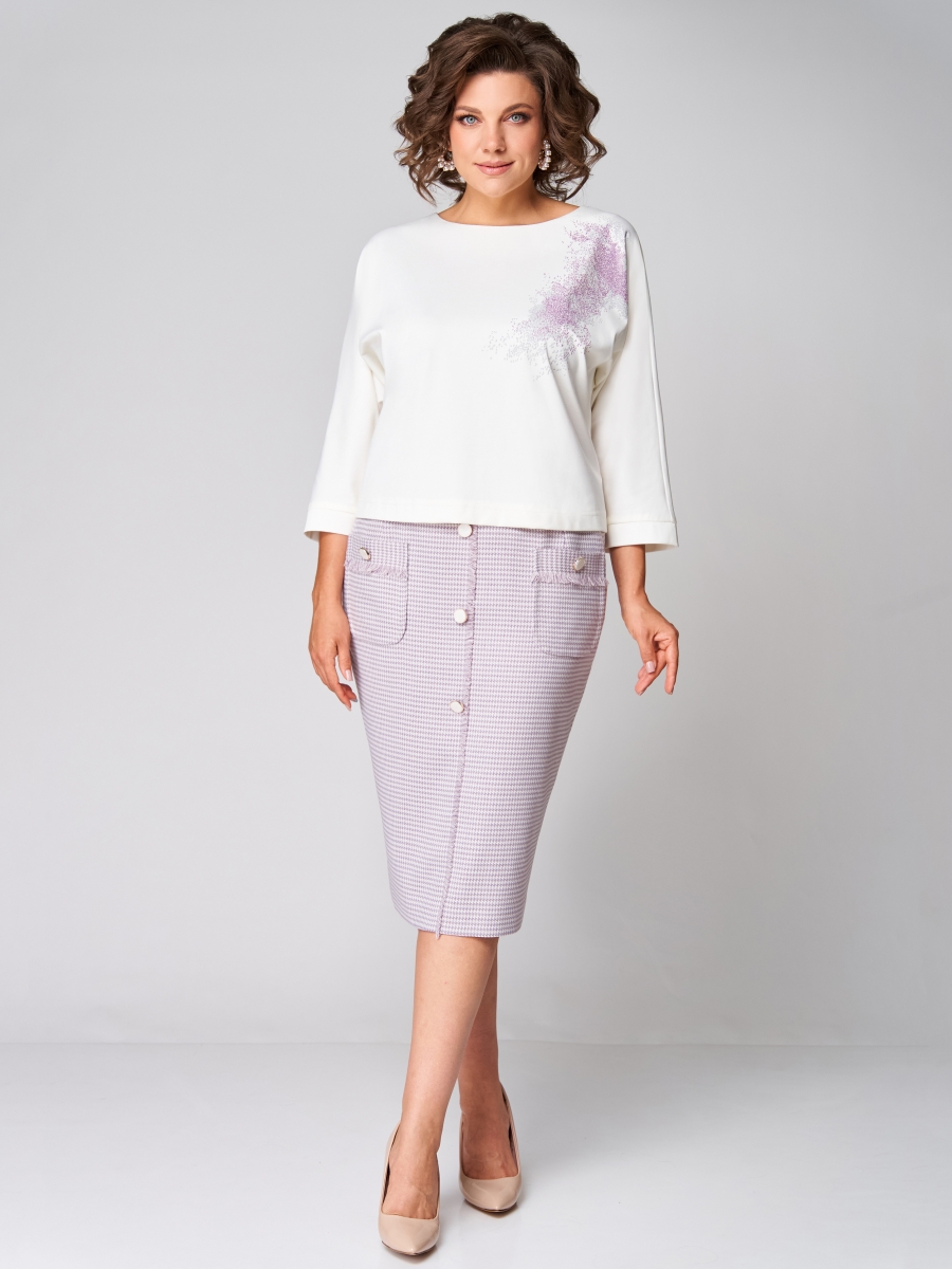 Юбка, слегка зауженная к низу, по переду накладные карманы и декоративная отделка с пуговицами. Юбка на подкладке, по верху притачной пояс с резинками по бокам. Застежка в среднем шве заднего полотнища на потайную -молнию с петлей и пуговицей.