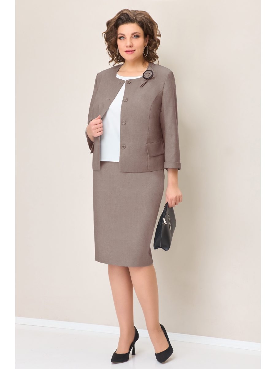 Классический костюм из текстильной ткани: полуприталенный жакет с округлой горловиной, прямая юбка со шлицей и легкая блуза.