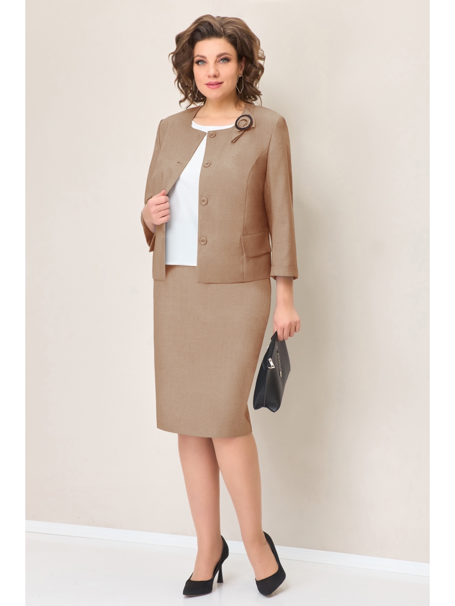 Классический костюм из текстильной ткани: полуприталенный жакет с округлой горловиной, прямая юбка со шлицей и легкая блуза.
