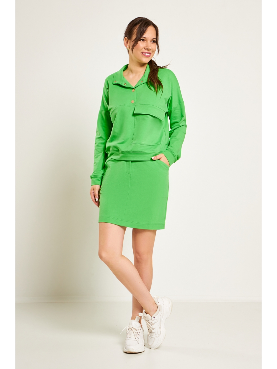 Комплект женский в спортивном стиле из легкой хлопковой ткани (футер, класс пенье). Джемпер прямого силуэта. По переду отрезная кокетка с функциональным настрочным карманом, застежка на кнопки, переходящие в воротник- стойку. Низ джемпера на притачной планке. Рукава спущенные, низ на притачной манжете. Юбка полуприлегающего силуэта, по переду функциональные карманы. Пояс отрезной с эластичной тесьмой , имитация молнии.