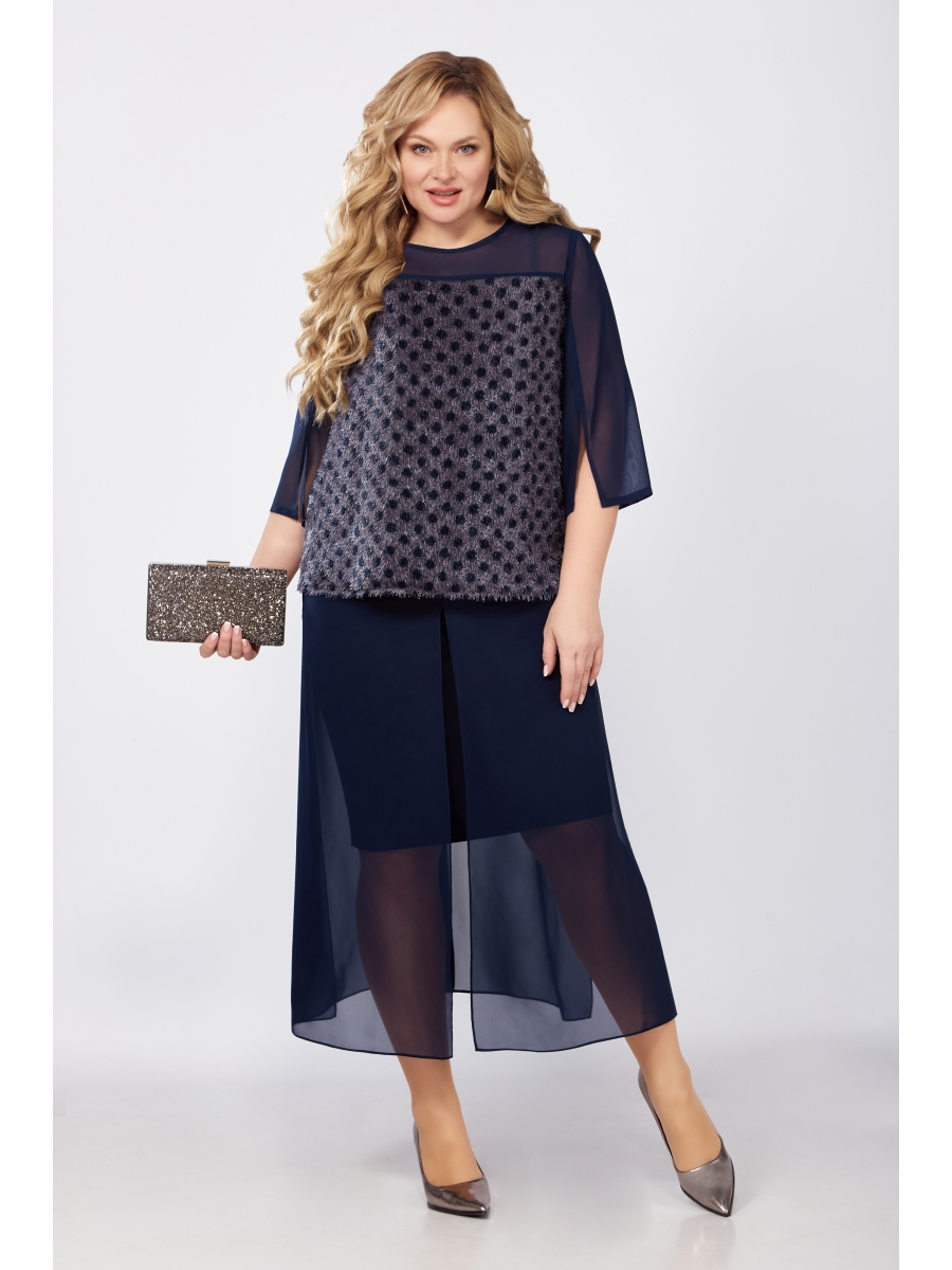 Двойная летящая юбка с верхним слоем из шифона, с глубокими разрезами. Нижняя часть юбки - прямая, со шлицей. По спинке юбки - застежка на молнию и пуговицу.