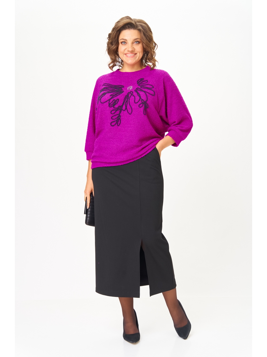 Джемпер выполнен из плотного трикотажа, с круглой горловиной и рукавами реглан «летучая мышь». Перед украшен изящной вышивкой, что придает изделию нарядный вид. Манжеты на рукавах и по низу выполнены из основной ткани.