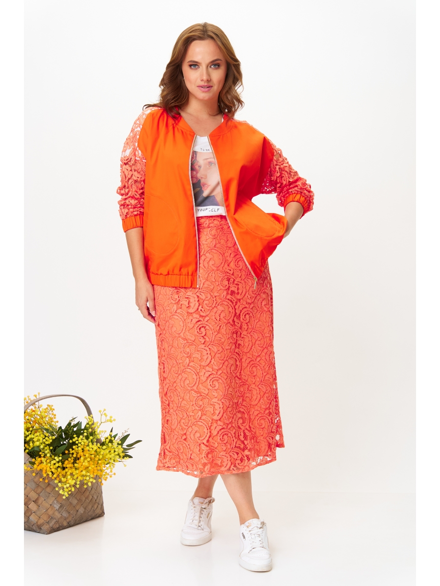 Комплект женский состоит из бомбера , юбки и футболки .Бомбер женский скомбинирован из текстиля гипюра , отлично подойдет для торжественных случаев и так же для летних прогулок . Застежка центральная на металлическую молнию . Спереди прорезные карманы в рамку с втачной листочкой и отделочной строчкой по контуру мешковины . Юбка женская из гипюра для повседневной носки и торжественных случаев . Юбка расширена к низу , длиной ниже колена . Застежка на потайную молнию и вставки из эластичной тесьмы по бокам пояса, подчеркивают линию талии . Футболка прямого кроя с втачными рукавом. По переду стойкая ,декоративная печать .