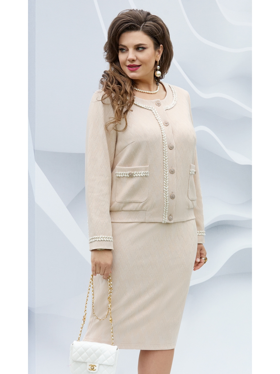Костюм, состоящий из трикотажного джемпера и юбки – это готовое решение, когда ничего не хочется усложнять. Трикотажный костюм с красивейшей вязкой имитирует стиль «Шанель».