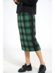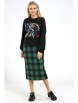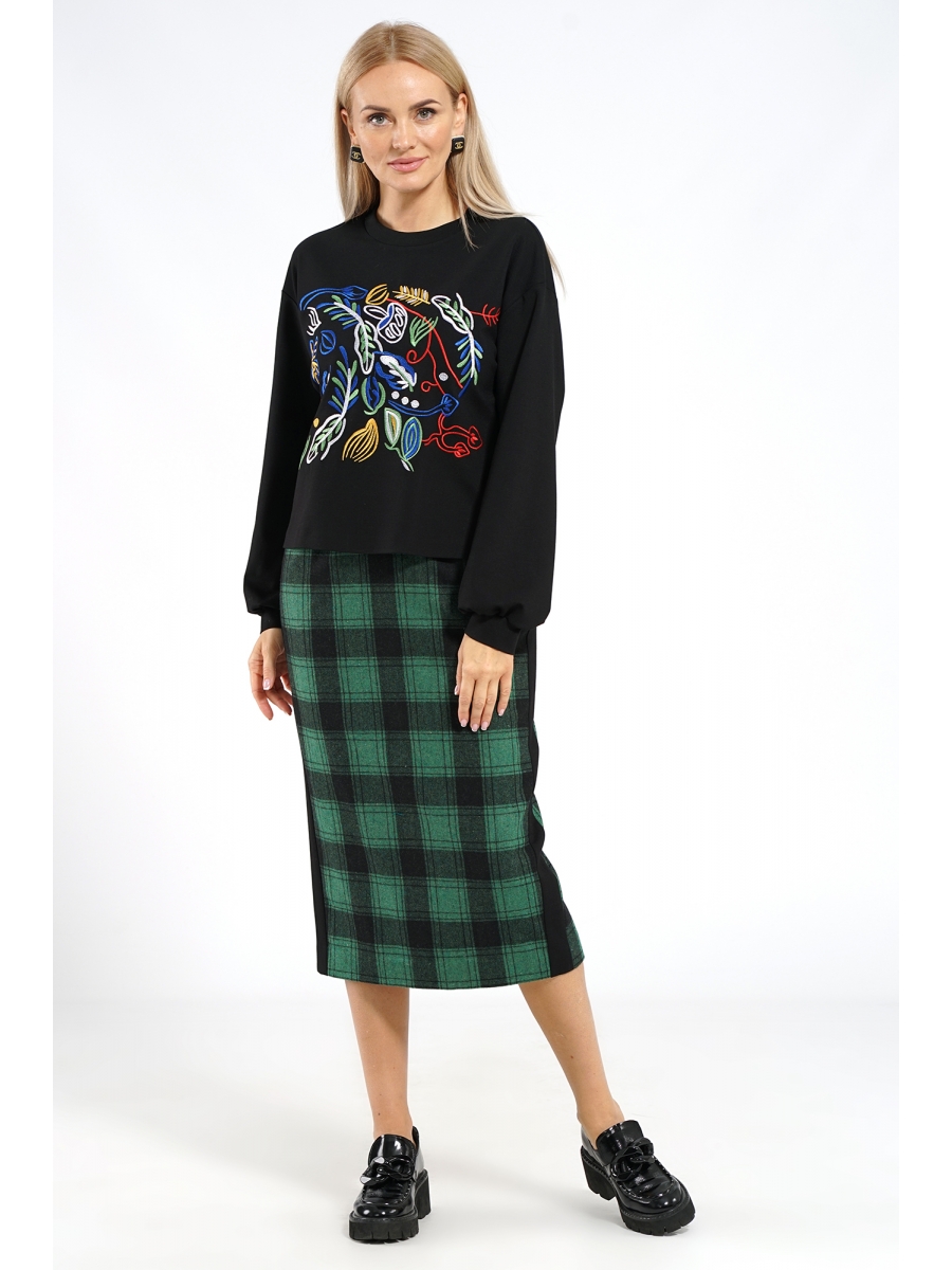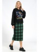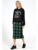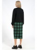 Юбка полуприлегающего силуэта книзу чуть заужена, на притачном поясе. Застёжка на тесьму-молнию по среднему шву спинки на потайную тесьму-молнию на петлю и пуговицу по поясу. Перед с боковыми частями выполнены из основной ткани (однотон) и талевыми выточками. Спинка со средним швом заканчивающаяся шлицей и талевыми вытачками.