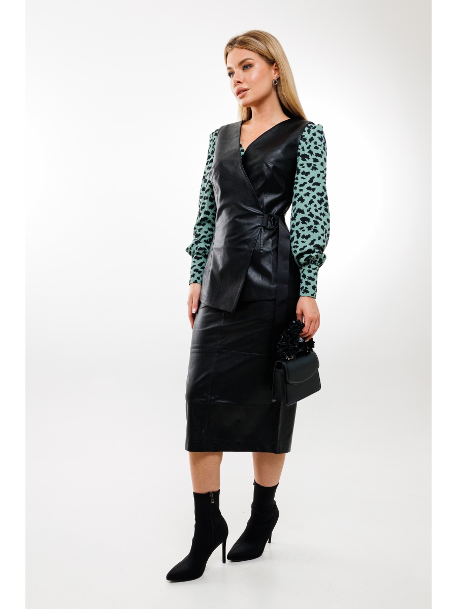 Юбка-карандаш прилегающего силуэта выполнена из мгкой эко кожи. По переду горизонтальные и вертикальные подрезы. Задняя часть юбки со средним швом. В среднем шве застежка на потайную тесьму молнию. По низу разрез.