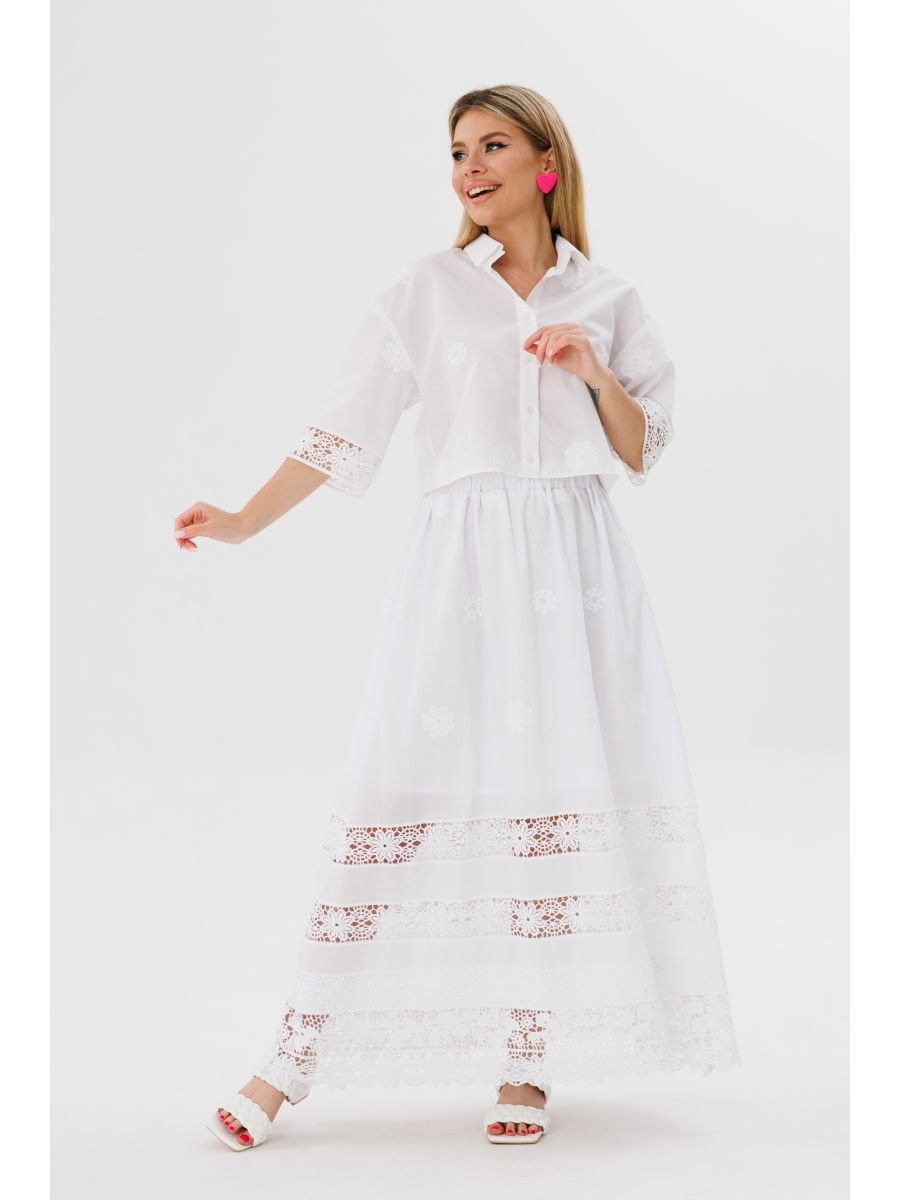 Рубашка укороченная, свободного силуэта, с центрально бортовой застежкой на петли пуговицы. Воротник на стойке отложной, рукав короткий.
