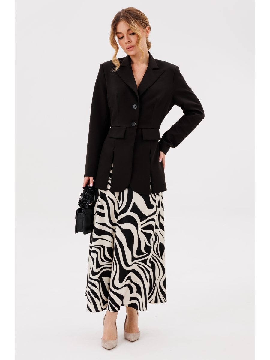 Жакет женский прилегающего силуэта, отрезной по линии талии. По переду в нижней части жакета разрезы. По линии талии декоративные клапаны. Рукав втачной длинный. Жакет на подкладке.