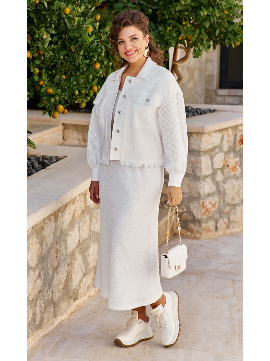 Женский комплект, состоящий из жакета из джинсовой ткани в сочетании с трикотажным полотном и юбки длины «миди», представляет собой идеальное сочетание комфорта, стиля и универсальности.