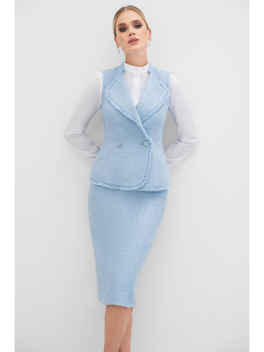 Костюм тройка, состоит из жилета полуприлегающего силуэта, блузки и юбки-карандаш.
