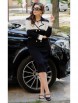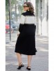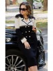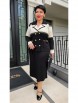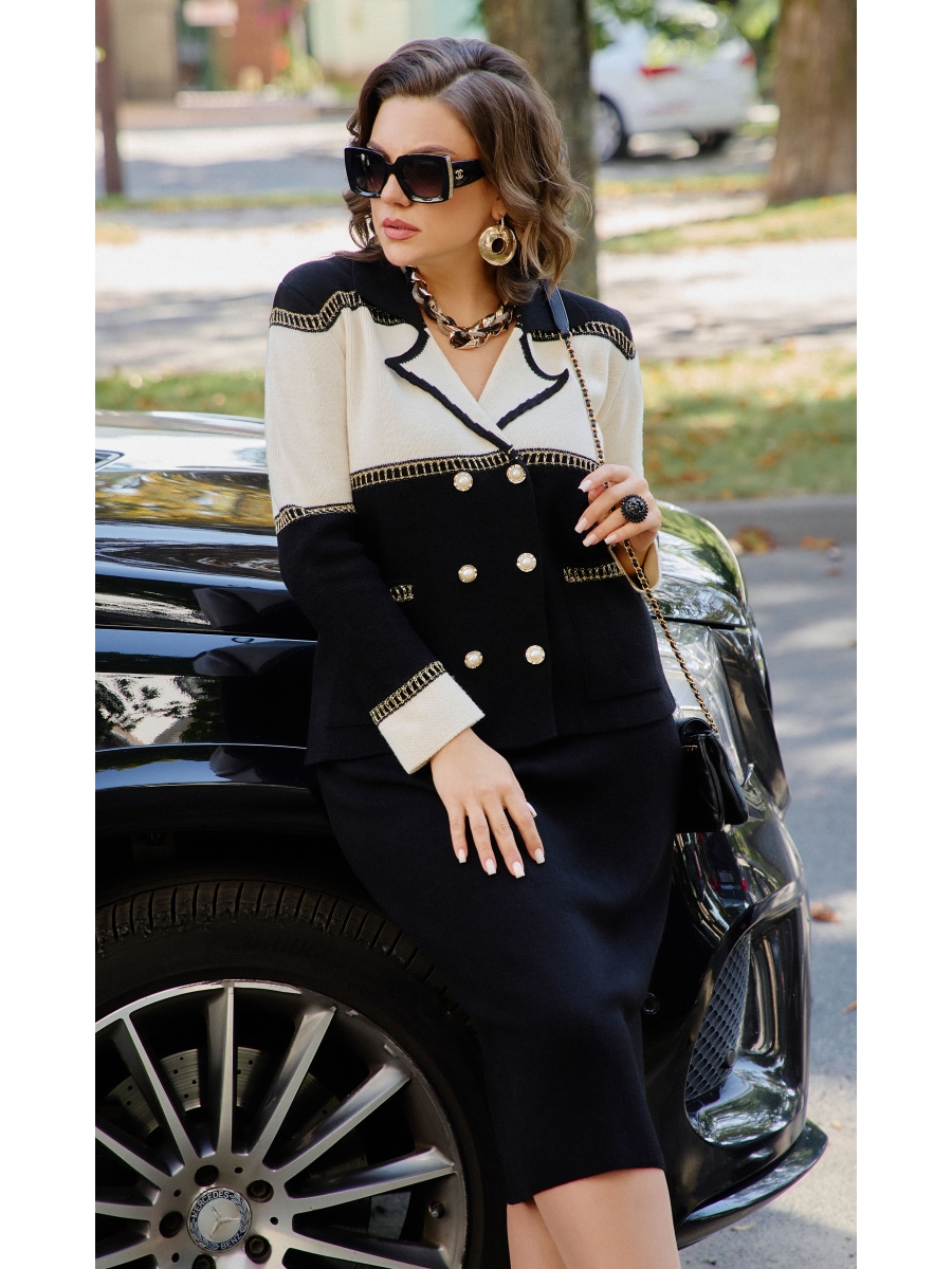 Жакет прямого силуэта, в благородном сочетаний черного и молочного оттенков, с двубортной застёжкой на петли пуговицы, воротник отложной с фигурными лацканами и накладными карманами по переду. Спинка без особенностей. Рукав втачной, длинный. В качестве дополнительной декоративной отделки жакета-вышивка золотой маталлизированной нитью.