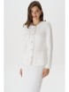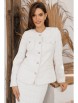 Жакет женский с центральной бортовой застёжкой до верха на 5 петель и пуговиц (размер и цвет фурнитуры может незначительно отличаться от фото) и отделочной тесьмой с жемчугом, идущей по горловине, вдоль борта, карманам, низу изделия и низу рукавов. Перед жакета с рельефными швами, выходящими из проймы до низа и талиевыми вытачками. Правая полочка с двумя накладными карманами, нижний с прямыми углами и отделочной тесьмой вдоль входа в карман, верхний с закругленными углами и отделочной тесьмой вдоль шва настрачивания кармана, вход верхнего кармана застегивается на 1 петлю и пуговицу. Левая полочка с одним нижним накладным прямоугольным карманам с тесьмой вдоль входа в карман и верхней листочкой обманкой с тесьмой и 1 петлей и пуговицей. Спинка со средним швом и двумя вертикальными рельефными швами, выходящими из проймы до низа изделия. Рукава втачные, двухшовные, длинные. Горловина круглой формы, обтачная. Плечевой пояс оформлен плечевыми накладками.