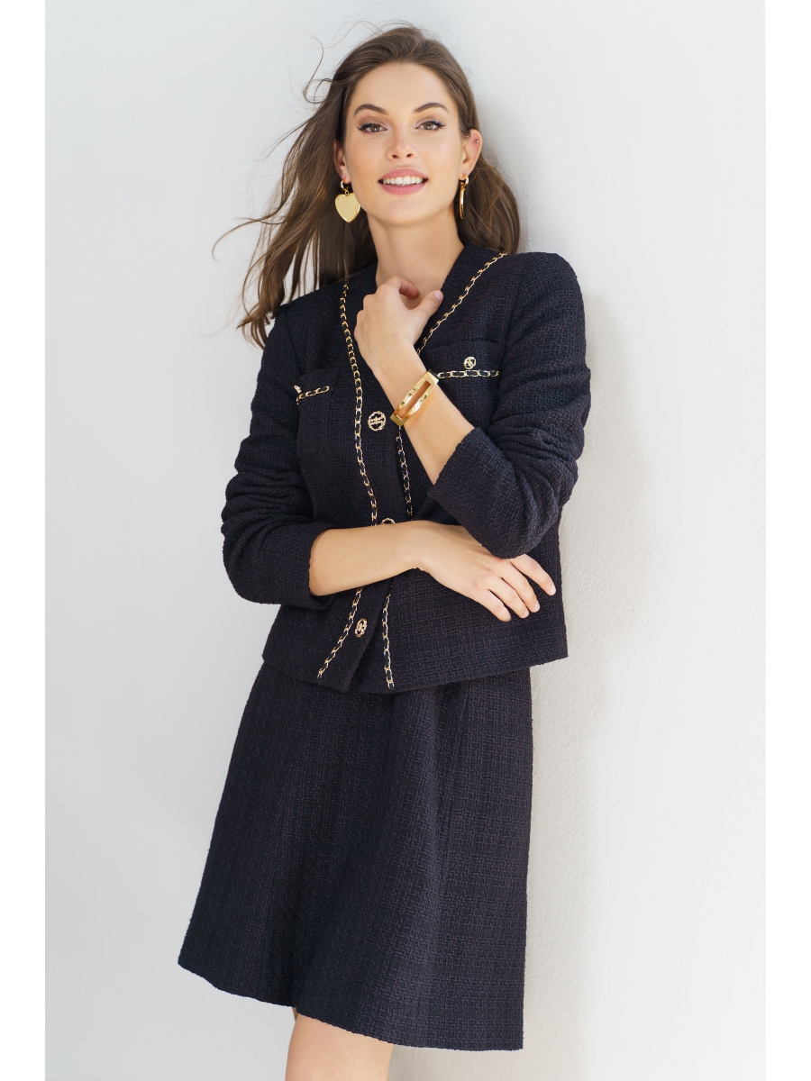 Жакет с изысканной отделкой золотой цепочкой и пуговицами добавляет нотку роскоши и подчеркивает изящность силуэта.