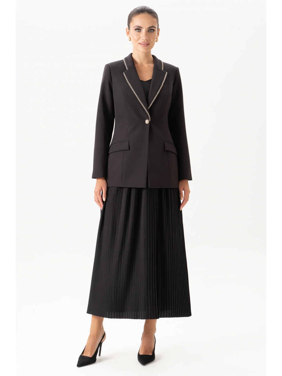 Удлиненный жакет с идеальной посадкой, дополненный изысканной цепочной отделкой по лацканам, придает образу нотку благородства. Плиссированная юбка добавляет легкость и динамику, подчеркивая женственность и стиль. Этот ансамбль — идеальный выбор для делового ужина, торжественного мероприятия или официальной встречи. Завершите образ минималистичными аксессуарами и классическими туфлями на каблуке для создания безупречного впечатления.