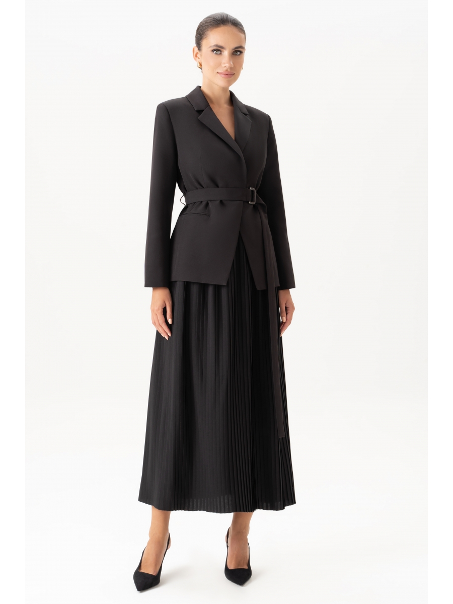 Этот костюм представляет собой идеальное сочетание элегантности и минимализма. Жакет приталенного кроя с лаконичным поясом подчеркивает талию, создавая женственный силуэт. Плиссированная юбка миди добавляет образу легкости и динамичности, а насыщенный черный цвет делает комплект универсальным и подходящим для любого повода. Этот костюм станет отличным выбором для деловой встречи, вечернего мероприятия или стильного повседневного выхода.