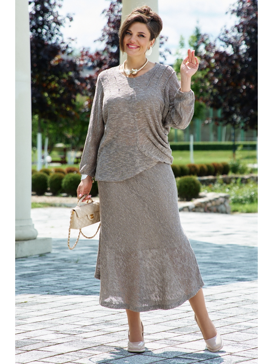 Это трикотажный джемпер с асимметричными линиями и низом в комплекте с юбкой по косой, прекрасно подойдут для вечерних прогулок или для каждодневной носки. Те из нас, которые привыкли себя баловать комфортными и элегантными вещами, безусловно оценят этот комплект. Джемпер с цельнокроеным рукавом и манжетом. По левому боковому шву небольшая сборка. V-образная горловина, по плечу три декоративных защипа. По переду центральный шов со смещением влево. Спинка также со средним швом.