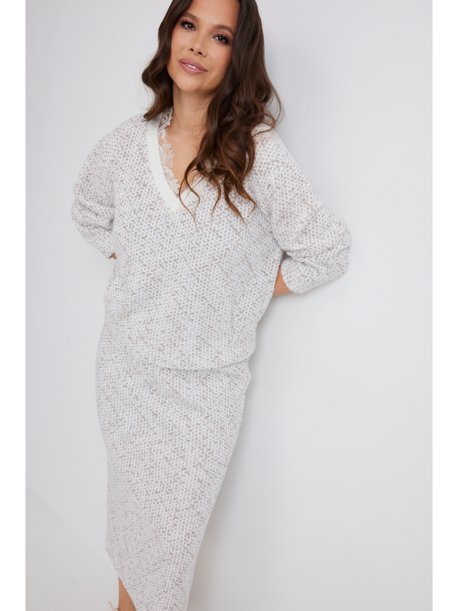 Элегантный и нежный комплект из джемпера и юбки, выполненных из вязаного, слегка пушистого трикотажного полотна с россыпью мелких, слегка мерцающих пришивных пайеток.