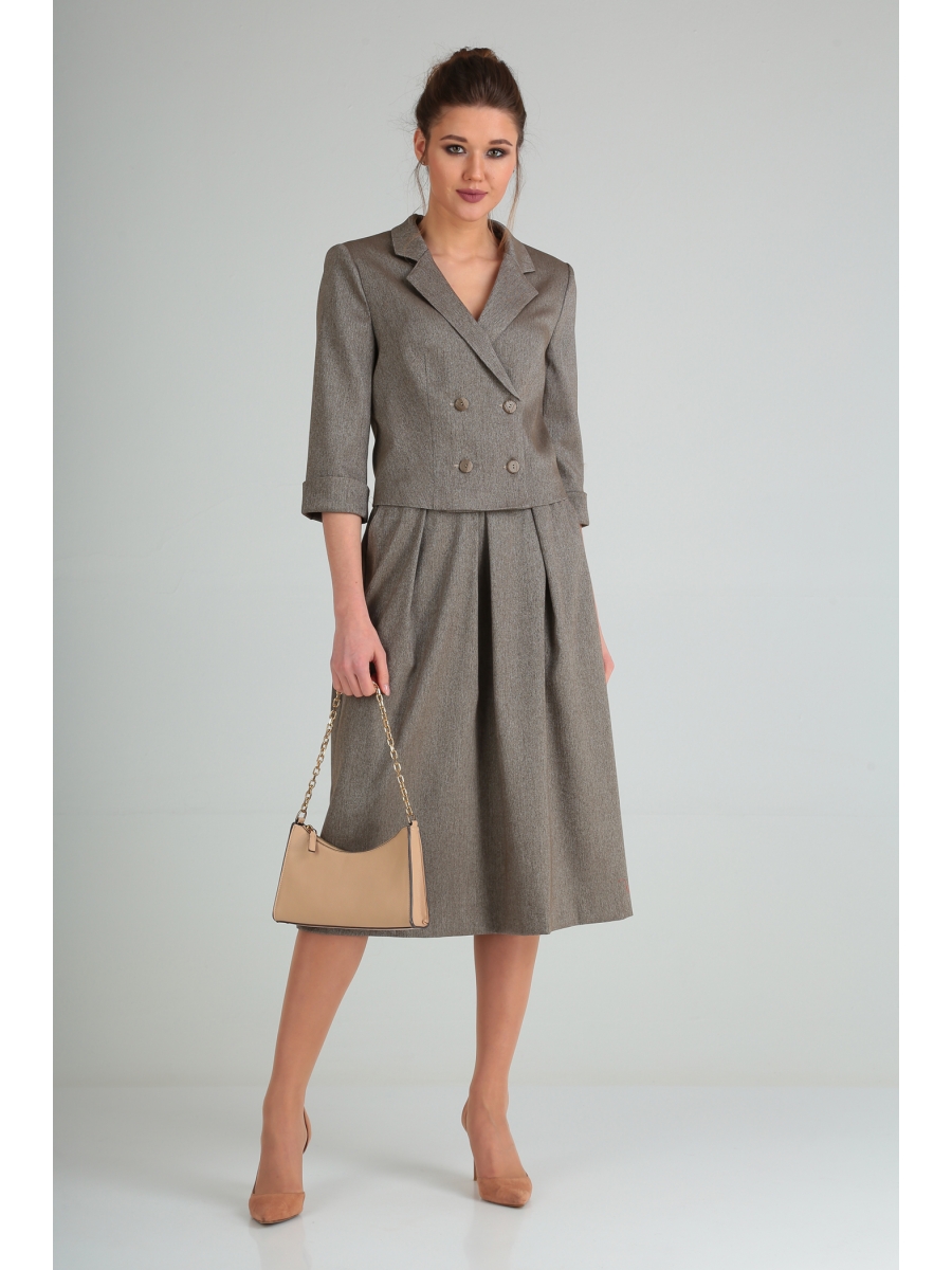 Жакет полуприлегающего силуэта, двубортный. Воротник пиджачного типа с лацканами. Рукава втачные, двухшовные на манжетах, 3/4. По переду и спинке изделия вытачки в области лини талии.