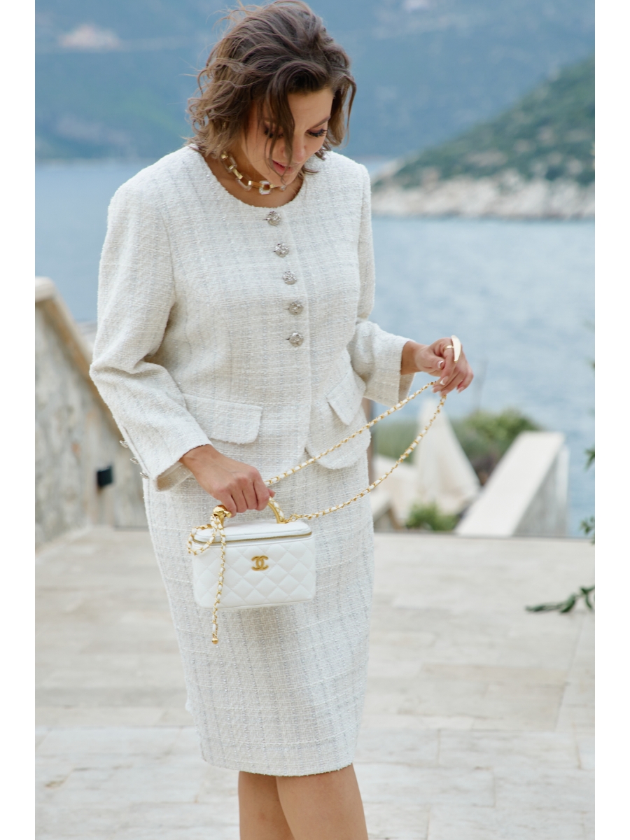 Костюм женский, двух-предметный, состоящий из укороченного жакета и юбки-карандаш, создавая безупречный и утонченный образ. Основа ткани — роскошный твид, в который искусно вплетена тонкая люрексовая нить, придающая полотну деликатное мерцание и благородный блеск.