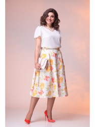 Юбка полу солнце, длиной до середины икры. Переднее полотнище с двумя односторонними складками, с карманами в боковых швах. Заднее полотнище цельнокроеное. Застежка на потайную тесьму-молнию в левом боковом шве. Юбка с притачным поясом с застежкой на пришивную пуговицу. Пояс с двумя настрочными шлевками.