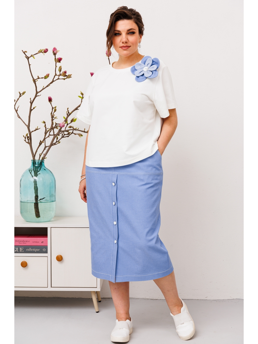 Блузка женская, прямого силуэта, длиной до линии бёдер. Перед и спинка цельнокроеные. Перед декорирован съёмным украшением. Горловина круглая, с втачной планкой. Блузка со спущенным плечом. Рукав втачной короткий, одно шовный. Блузка без плечевых накладок. Юбка женская прямая, длиной до середины икры. Переднее полотнище с отрезной кокеткой, с 2-мя карманами в боковых швах, с притачной планкой, с застёжкой на 4 обмётанные петли и 4-и пришивных пуговицы. Заднее полотнище с 2-мя таллиевыми вытачками на отрезной кокетке.