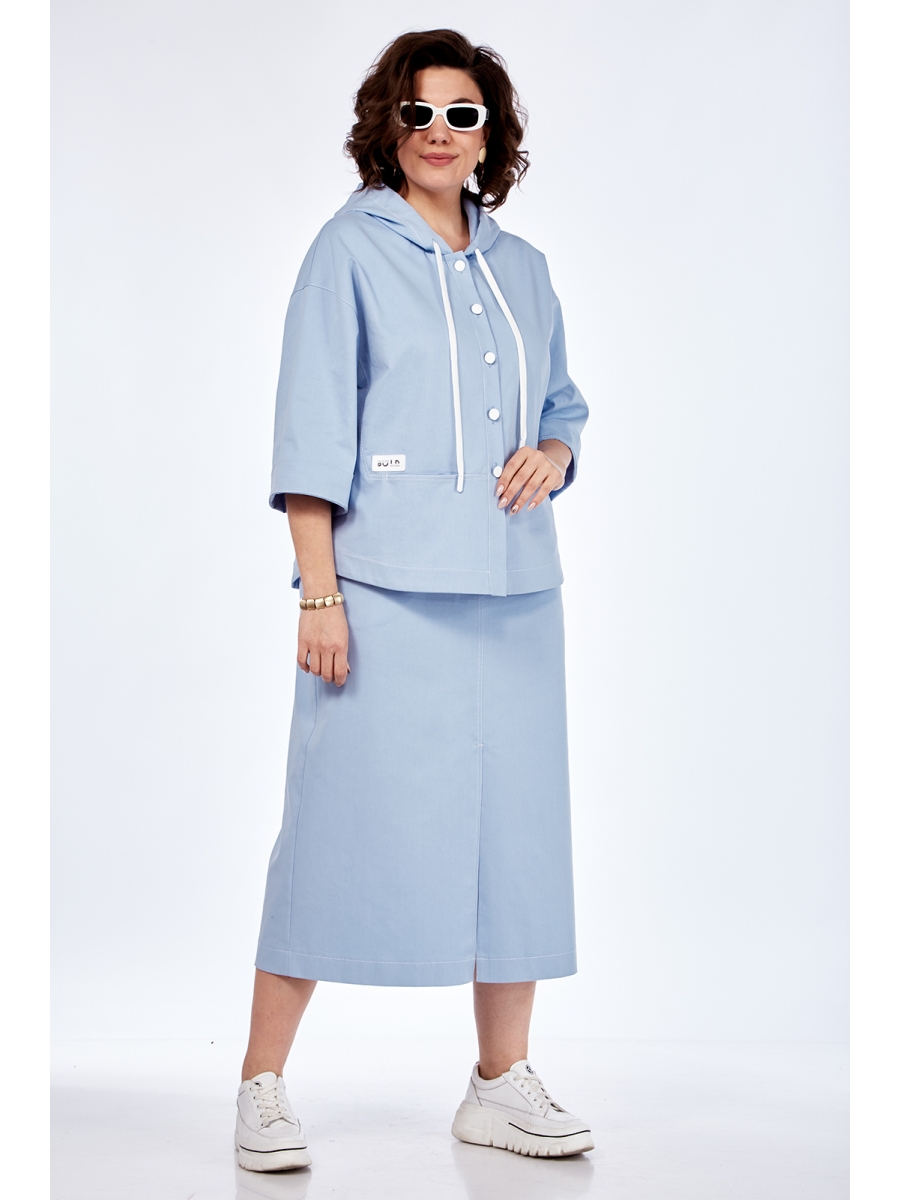 Костюм женский, юбочный, состоит из: облегченной ветровки и юбки. Выполнен из джинсовой ткани. Ветровка, свободного кроя. Перед и спинка с фигурными подрезами. Горловина оформлена капюшоном, с втянутым шнуром. Застежка-планка на петли и пуговицы. Карманы обработаны в швах, декор-нашивка и отделочные строчки. Юбка прямого силуэта. Переднее полотнище со средним швом, разрез внизу. В юбке обработан пояс, застежка на пуговицу и тесьму-молнию, обработаны боковые карманы. На заднем полотнище-кокетка и накладные карманы.