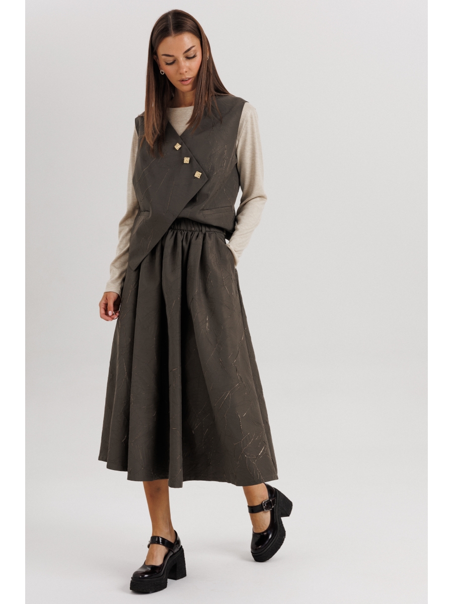 Комплект состоит из трёх изделий: расклешённой миди-юбки, асимметричного жилета и базового лонгслива. Модель сочетает лаконичный дизайн и продуманный крой, создавая гармоничный образ для офиса, прогулок или повседневных встреч.