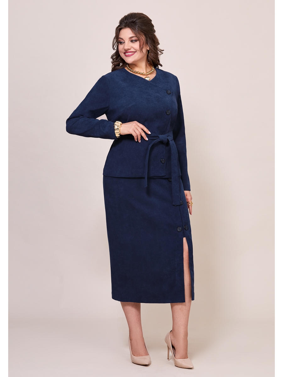 Юбка прямого покроя, из основной ткани, по переду обработан разрез и имитация планок, декорированы пуговицами. Заднее полотнище юбки с вытачками и средним швом, в среднем шве потайная молния, верхний срез обработан притачным поясом.