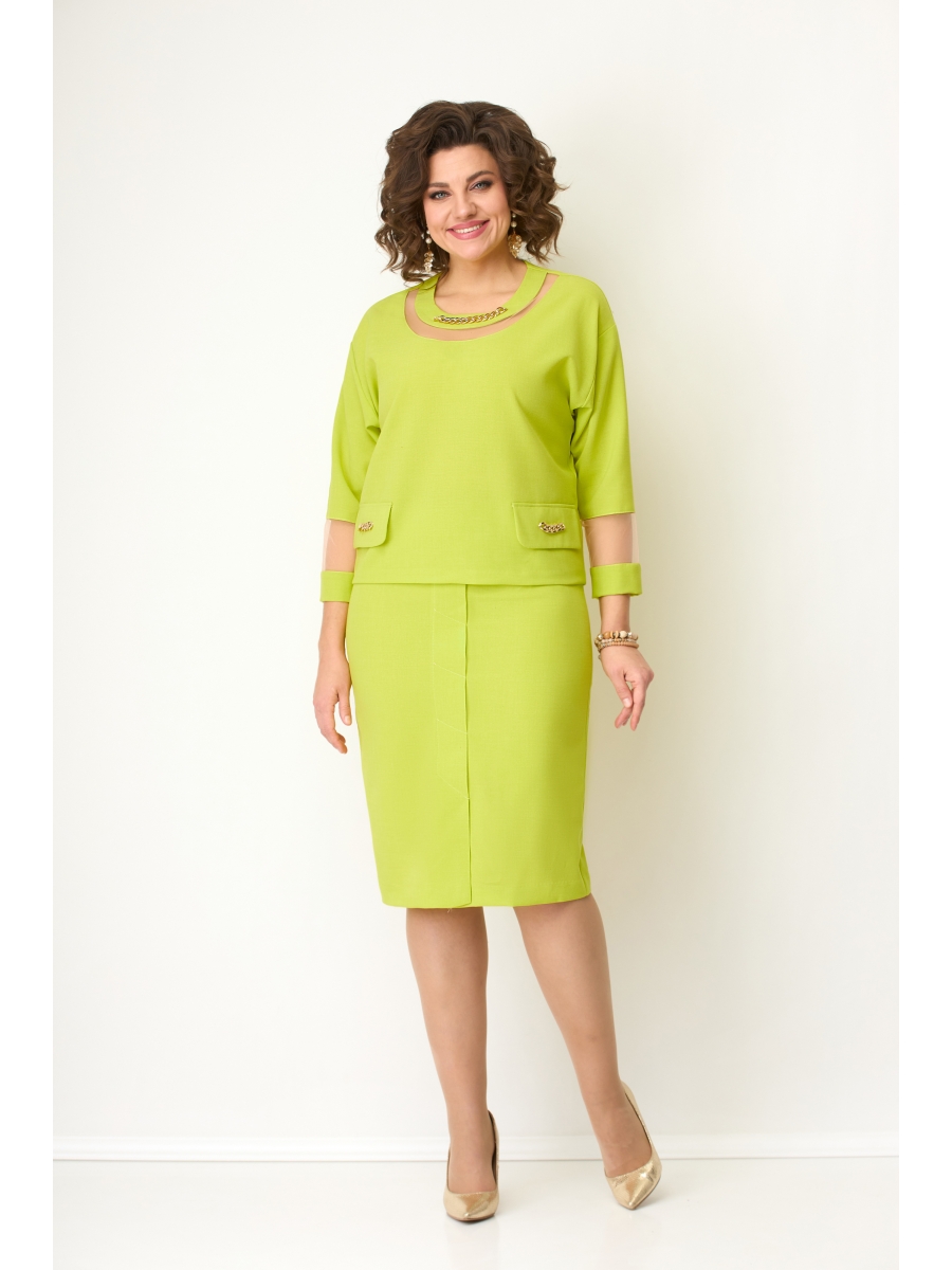 Костюм женский двухпредметный, состоящий из блузы и юбки. Блуза силуэта летучая мышь со спущенным рукавом. Горловина переда состоит из сетки и декоративной планки. Рукав заканчивается манжетой. По переду декоративные клапаны из отделочной ткани. Спинка со средним швом на обтачке. Юбка силуэта-карандаш. По переду и спинке обработаны кокетки от которых идут талиевые выточки. На заднем полотнище по центру потайная молния. На переднем цельнокроеная складка имитирующая планку заканчивающейся шлицей. Юбка на подкладке. Длина блузы в 50р-54 см, длина юбки в 50р-64 см