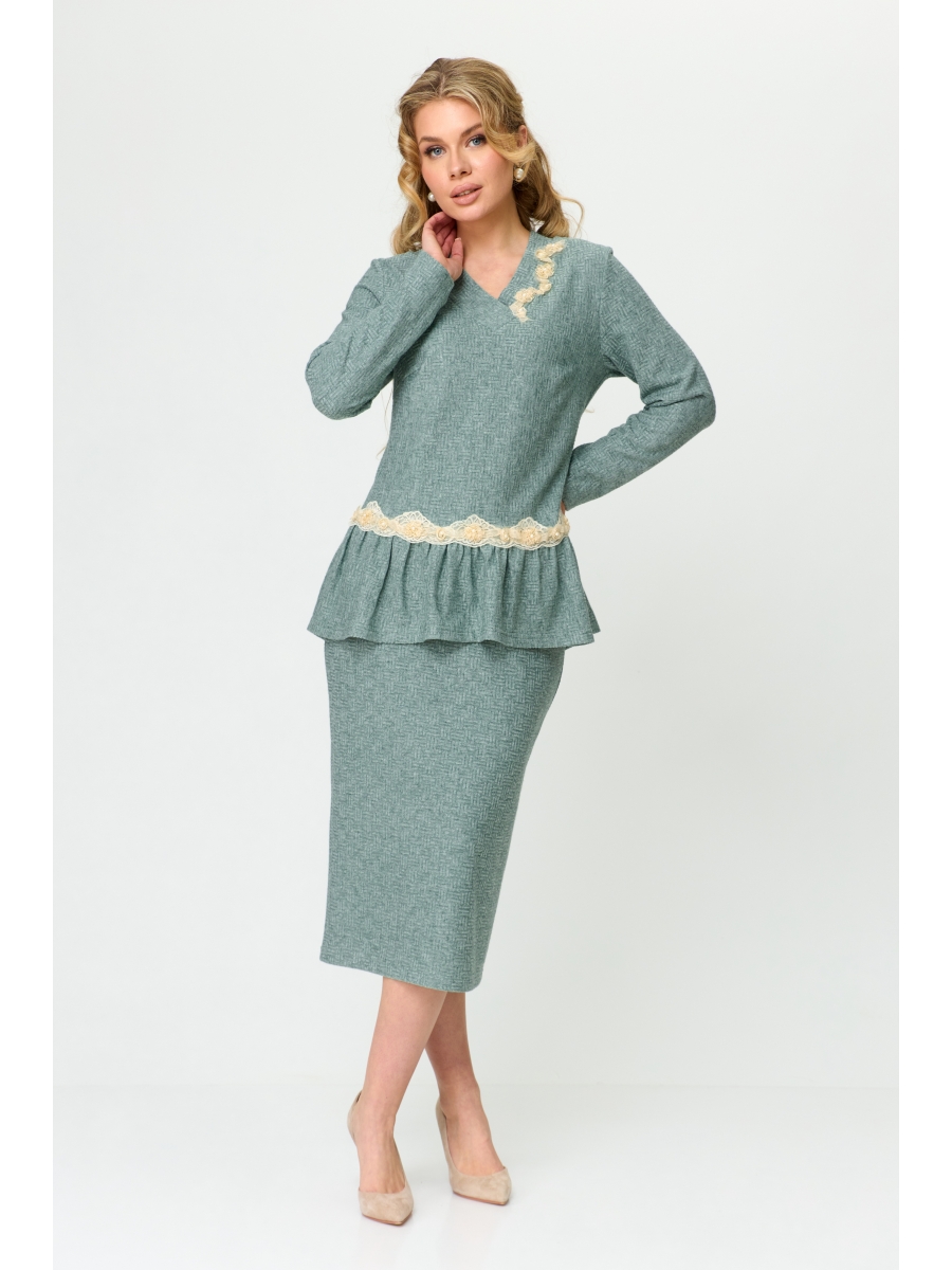 Джемпер полуприлегающего силуэта с баской от талии. По горловине планка. Рукав зауженный длинный. Баска со сборкой. Синка длиннее переда. Кружево цвета ванили украшает горловину и баску.
