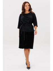Юбка на поясе выполнена из кружевного полотна на подкладке из основной ткани. На поясе по бокам эластичная тесьма. По среднему шву задней половинки юбки молния, снизу разрез 13,5 см.